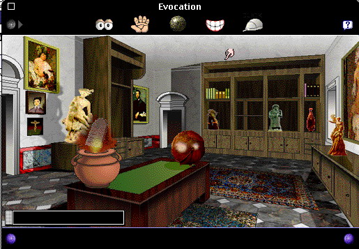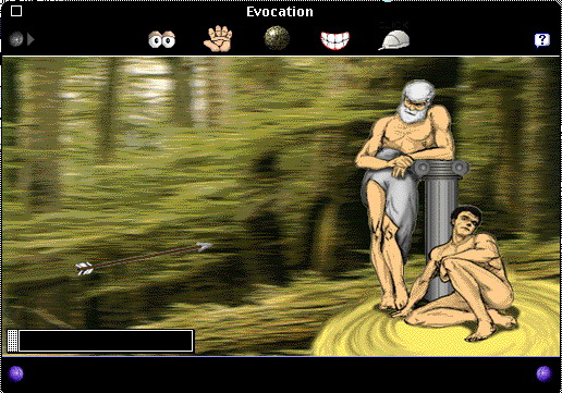In questo Evocation si discosta da Myst: non ci sono macchinari da attivare e poche combinazioni da inserire, sotto questo punto di vista l’impostazione degli enigmi è il classico raccogli-usa degli oggetti trovati in giro qua e la. Spesso, nel corso dell’avventura, assisteremo ad alcune visioni nelle quali incontreremo grandi filosofi o sapienti di tutte le epoche che a nostra domanda risponderanno con arguti indovinelli. A dire la verità il gioco è parco di informazioni, la difficoltà della risoluzione sta tutta qui, nel sapere cosa fare, tanto che non di rado ci troviamo a risolvere inaspettatamente qualche enigma proprio dopo averle “provate tutte”, in definitiva un po’ a casaccio. Intendiamoci è affatto logico, una volta risolto un enigma non ci si trova ad esclamare “E questo che c’entra?”, ma è solo questione di fortuna risolvere qualche enigma proprio perché il gioco non da indizi. Sicuramente non è un gioco che si finisce in un paio di giorni.