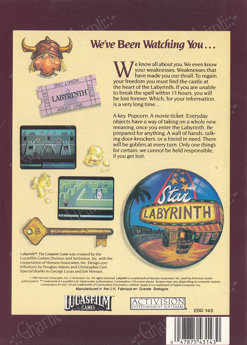 Nel 1986 LucasFilm Games si occupa ancora esclusivamente di sviluppo software delegando la pubblicazione dei propri giochi a terzi: principalmente ad Atari, sui suoi sistemi, ad Epyx, Activision ed Electronic Arts sugli altri home computer. A partire da Maniac Mansion, di cui soltanto le prime edizioni sono distribuite da Activision, Lucasfilm Games inizia a ritagliarsi maggiore indipendenza fino a diventare anche editore, per lo meno su suolo statunitense. Activision si occupa della distribuzione di Labyrinth per Commodore 64 e Apple II portandolo in Europa nei primi mesi del 1987 sia direttamente come nel Regno Unito, sia affidandone la distribuzione ai vari partner nazionali.