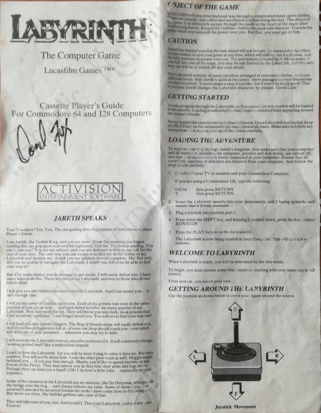 La versione per Commodore 64 di Labyrinth su nastro per Datassette è un'esclusiva europea inevitabile data la diffusione che i giochi su nastro hanno nel vecchio continente, fortemente spinti dal prezzo contenuto (e dalla pirateria). La confezione è tipica: la custodia in plastica racchiude la copertina, il manuale stampato su un unico foglio ripiegato in quattro e il nastro. Sul retro della copertina la scritta Manufactured in U.K. certifica l'origine di quest'edizione che dai cataloghi Lago Softmail veniva venduta inizialmente a 19.900 lire.