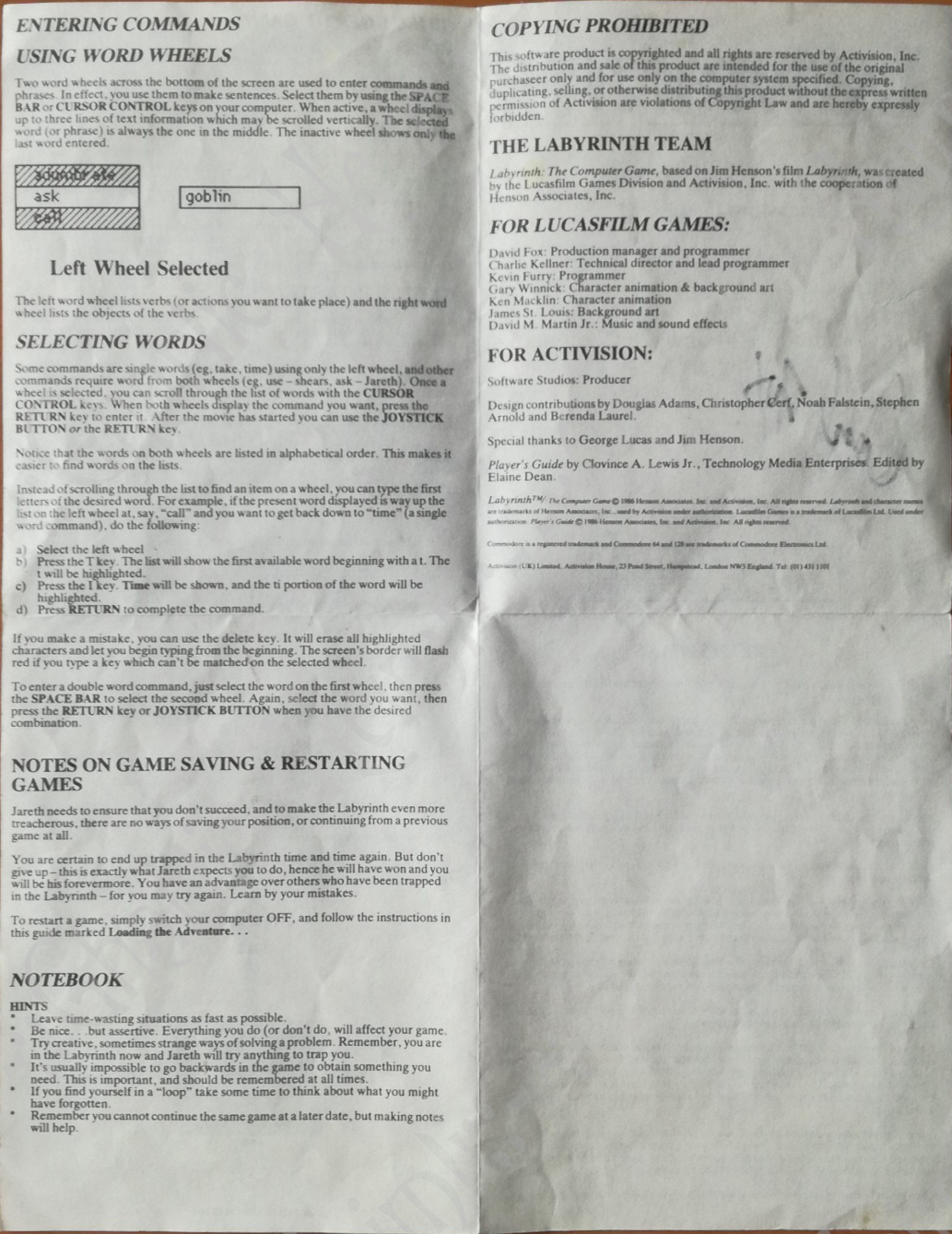 L'edizione UK su dischetto di Labyrinth: The Computer Game differisce dalla relativa edizione USA che aveva la scatola di cartoncino leggero tipica delle pubblicazioni LucasFilm Games di fine anni Ottanta come le prime due edizioni USA di Maniac Mansion e l'edizione di Zak McKracken And The Alien Mindbenders arrivata anche in Italia.