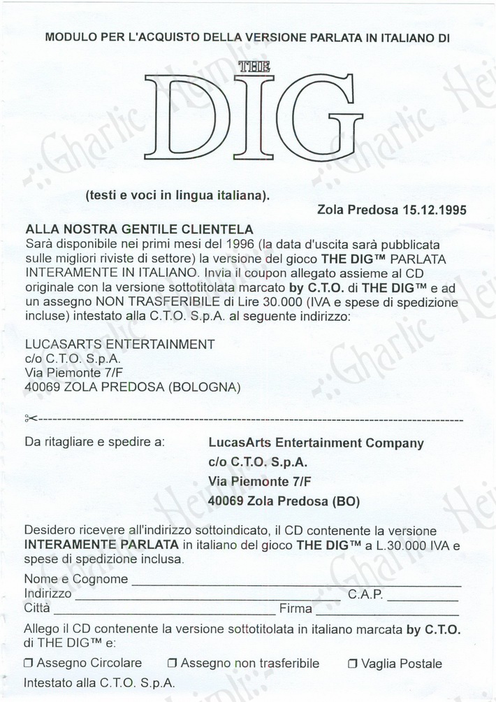 Similmente a quanto fatto per Full Throttle anche di The Dig uscì una versione preliminare sul mercato italiano, con sottotitoli in italiano e doppiaggio in inglese. A livello di packaging abbiamo manuale e scatola localizzati, con l'aggiunta però di una cedola per la richiesta della versione doppiata in italiano che sarebbe uscita di lì a poco. Sul CD-Rom non appare nessuna dicitura, mentre al contrario nelle successive ristampe ci sarà sempre un'indicazione dell'edizione di appartenenza. Questa versione intermedia pare essere piuttosto rara (una versione intermedia solitamente lo è), ma non abbiamo conferme assolute. Sicuramente è la meno rara tra le edizioni preliminari edite da CTO negli anni.