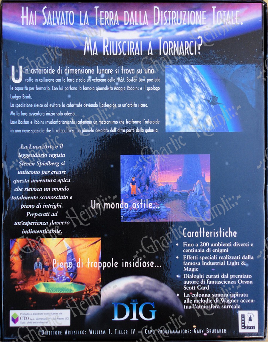 In Italia la C.T.O. distribuisce il gioco scatolato solo su PC nel novembre del 1995, dapprima in una versione intermedia con doppiaggio in inglese e sottotitoli in italiano, poco dopo pubblicando il gioco totalmente doppiato in italiano. La versione scatolata di The Dig presumibilmente non è mai stata ristampata. Più avanti, il gioco viene rieditato in due collane economiche della C.T.O. in confezione digipak. Per The Dig, inoltre, non esiste Libro degli Indizi in italiano.