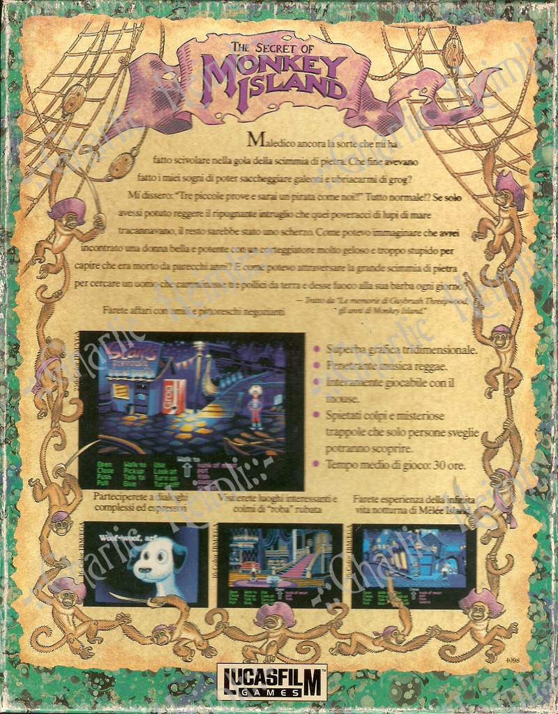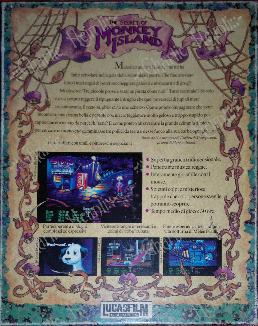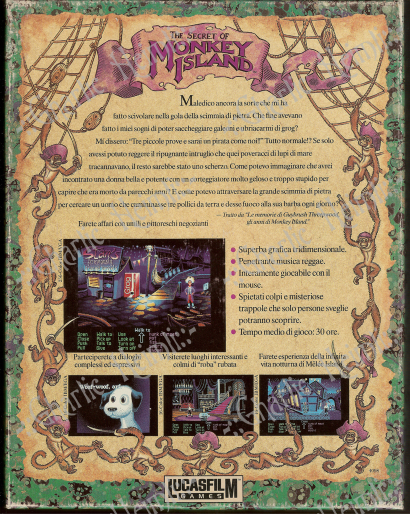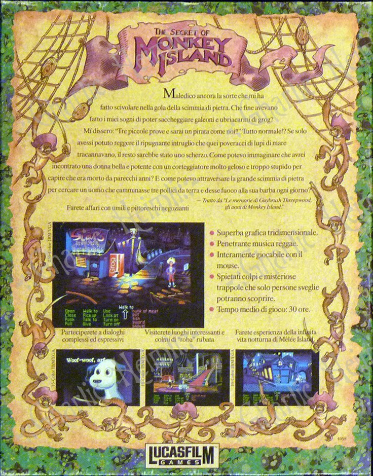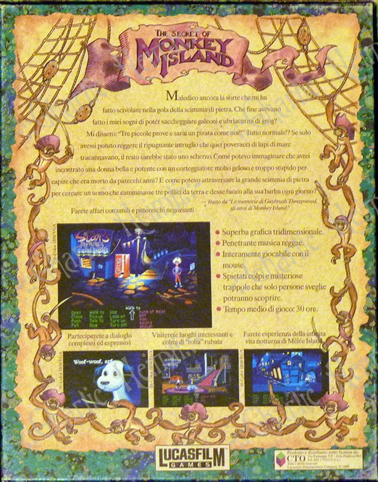 The Secret Of Monkey Island è la sesta avventura grafica della Lucasfilm Games, probabilmente la più nota e blasonata della software house californiana assieme al suo seguito. Nel giro di qualche anno dalla sua pubblicazione, avvenuta nel 1990, approda su mezza dozzina di home computer dell'epoca e conta una marea di edizioni diverse: si parte dalle prime versioni per Amiga, Atari ST e PC (disponibile in due edizioni; la prima con grafica EGA a 16 colori, la seconda in VGA a 256 colori entrambe reperibili sia su floppy da 5,25 pollici che da 3,5). L'anno successivo è la volta della versione per Macintosh su floppy disk, mentre del 1992 sono la versione per PC su CD-Rom (disponibile in più lingue tra cui l'italiano) e la versione per FM-Towns. Nel 1993 il gioco è edito su Sega CD, caso unico in tutta la storia delle avventure grafiche Lucasfilm, che negli Stati Uniti riscuote molto seguito. Infine nel luglio del 2009 viene rilasciata in digital delivery una Special Edition per Windows, Xbox, Macintosh, iPhone e iPad, che presenta il gioco totalmente ridisegnato e doppiato in inglese. La Special Edition di Monkey Island 1 è disponibile con sottotitoli in italiano.