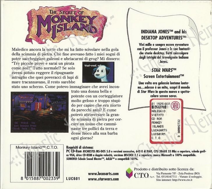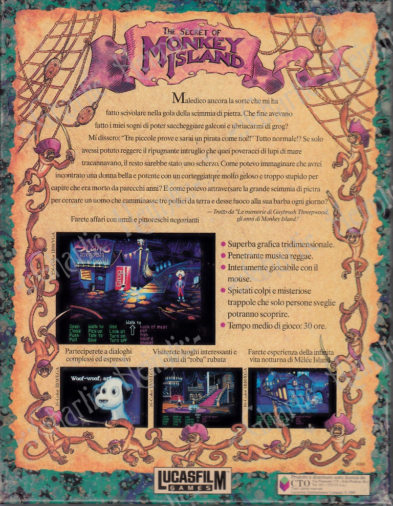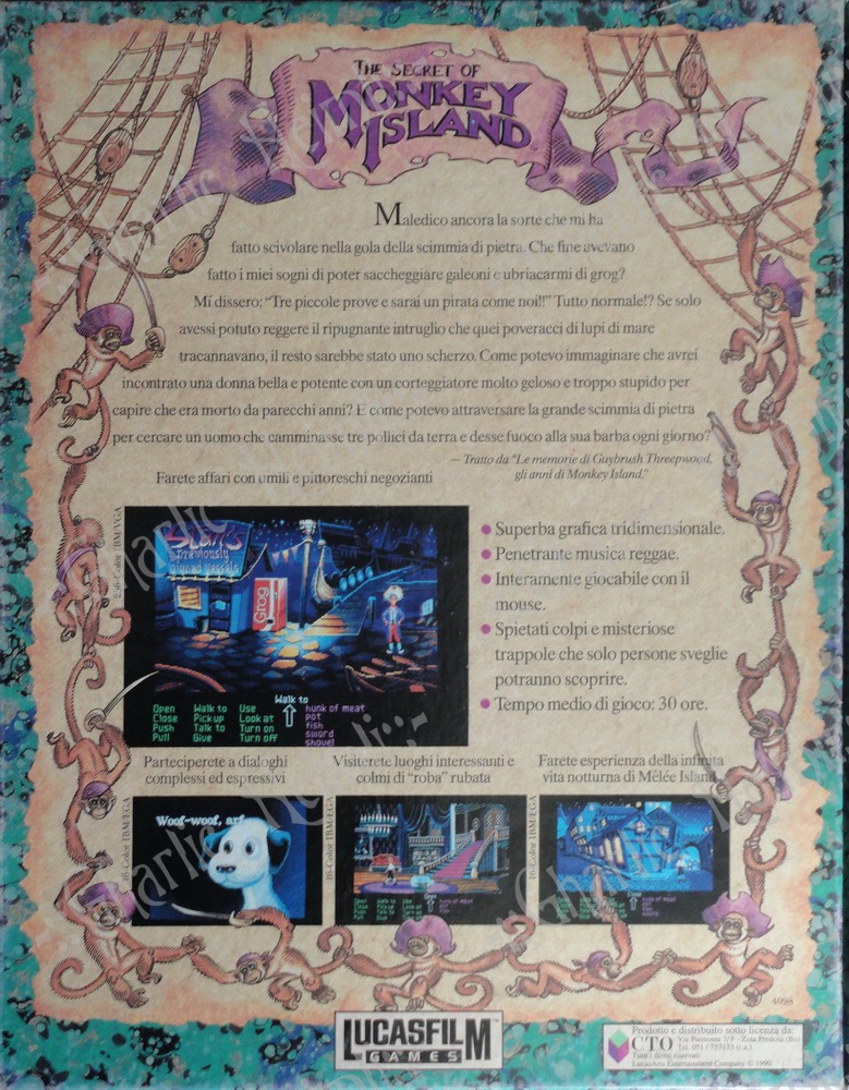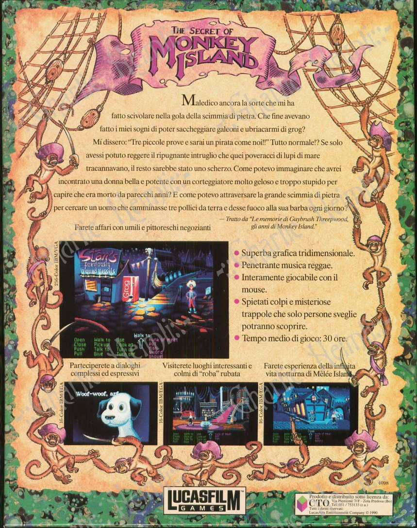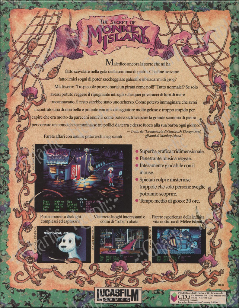 The Secret Of Monkey Island è la prima avventura grafica Lucas ad essere pubblicata da C.T.O. A partire dal febbraio 1991 è reso disponibile per PC (nelle due versioni EGA e VGA su floppy), Amiga e Atari ST; le prime due edizioni verranno ristampate nella loro confezione scatolata fino al 1993 (arrivando a contare ben cinque ristampe diverse). Inoltre un'ulteriore edizione in confezione cartonata contiene il gioco su CD-Rom. Nel 1995 il gioco su CD-Rom è inserito nella collana denominata Serie Nera dai collezionisti e successivamente appare in due edizioni economiche sempre su CD-Rom. Di The Secret Of Monkey Island infine è disponibile il Libro degli indizi che, per non smentirsi, conta due ristampe.