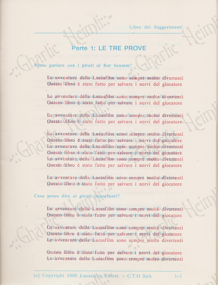 Il libro degli indizi italiano (gentilmente offerto da Dario) ha avuto due edizioni, come fu poi per Monkey Island 2 e per Indiana Jones And The Fate Of Atlantis. Nella prima edizione, datata marzo 1991, la frase «Le avventure della Lucasfilm sono sempre molto divertenti. Questo libro è fatto per salvare i nervi del giocatore.» scritta in rosso, codifica i suggerimenti, scritti in azzurro, che possono essere letti solo attraverso una strisciolina di gelatina rossa. La seconda edizione del libro (marzo 1995) è scritta nero su bianco, quindi non necessita di decodifica.